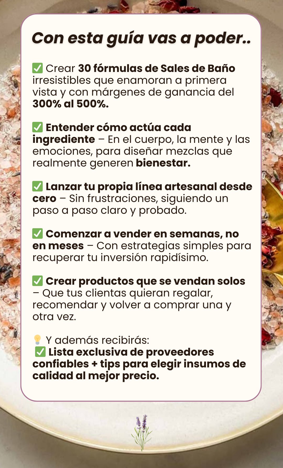 “Nunca imaginé que preparar sales de baño fuera tan fácil y terapéutico. Hoy mis clientas me piden más cada semana. ¡Estoy fascinada!”