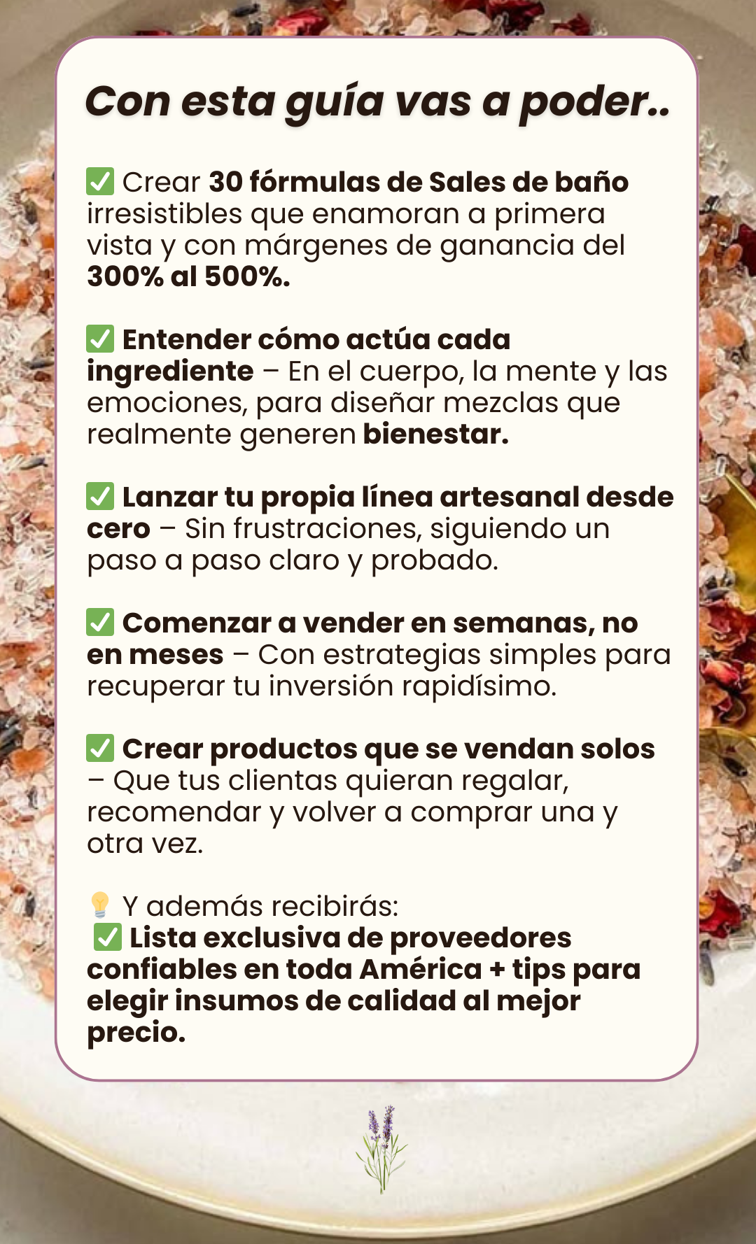 “Nunca imaginé que preparar sales de baño fuera tan fácil y terapéutico. Hoy mis clientas me piden más cada semana. ¡Estoy fascinada!”